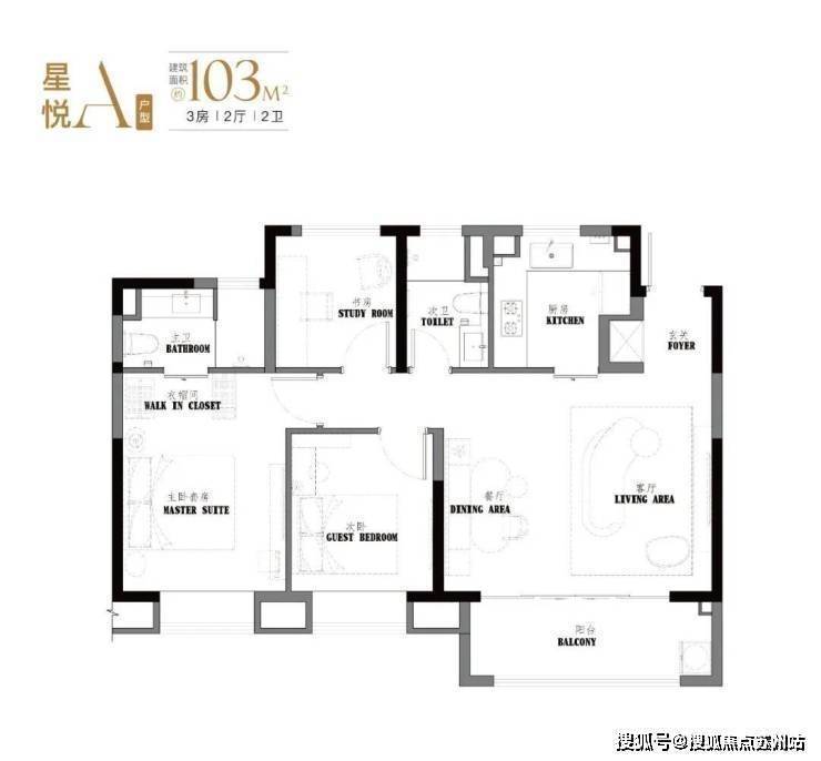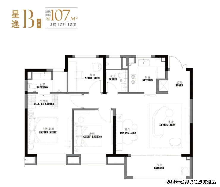 建面约107㎡整体布局与B户型基本一致,最明显的感觉是在尺度上进行了升级。