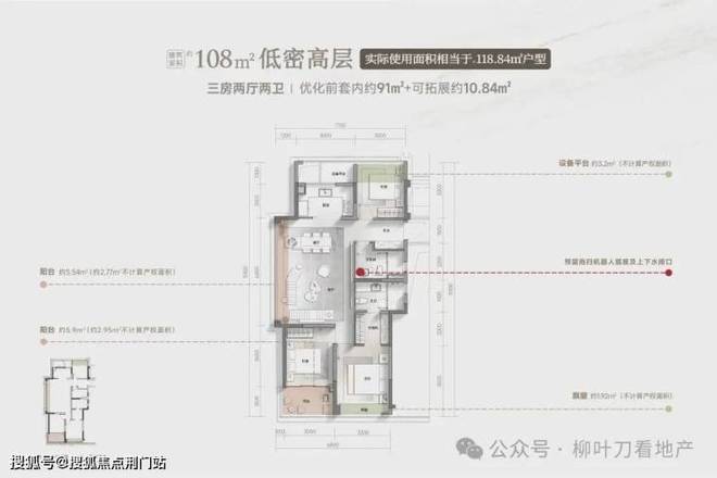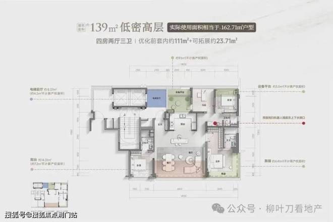 边套约12.7m超阔南向采光面,实际使用面积相当于常见的约120㎡户型;中间套实际使用面积相当于常见的约118.84㎡户型。