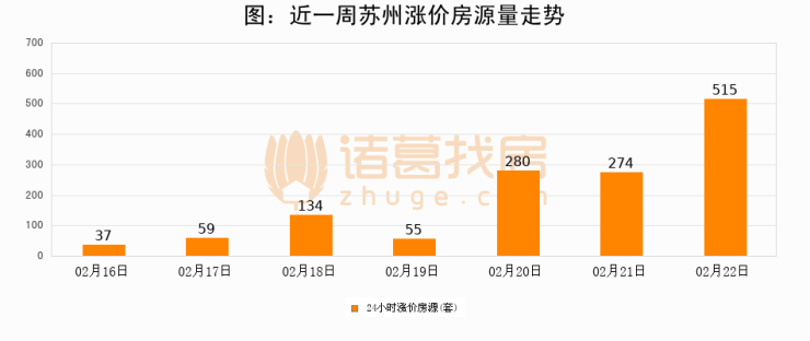根据诸葛找房数据显示,苏州24小时涨价房源量为515套,较02月21日增加241套,环比上涨88%。与此同时,涨价房源占比小幅扩大,业主信心有所提升。