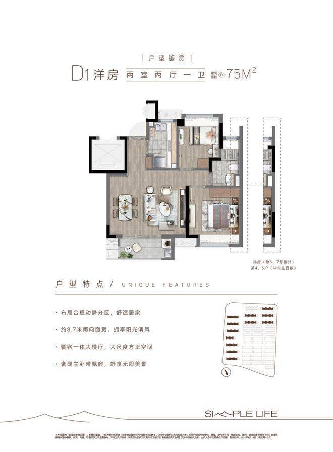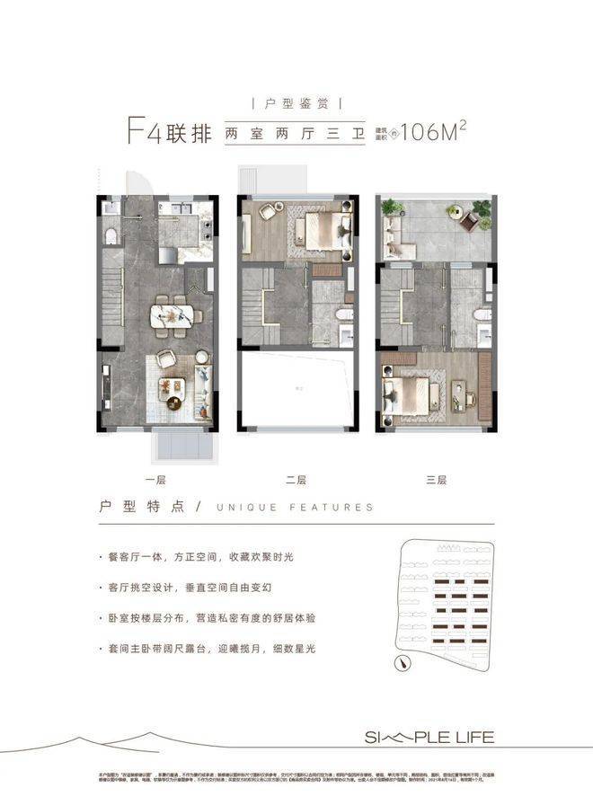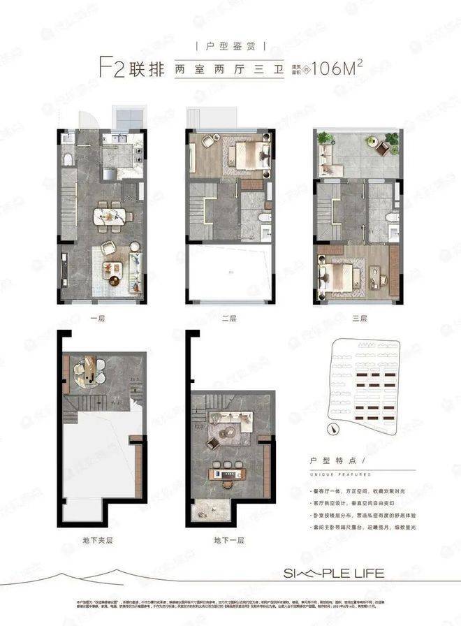项目合计47幢楼,其中洋房12幢554套,联排33幢301套,项目整体分两批次推出,总计855套。采用人车分流,即保证社区整体设计的美观,又保证业主的安全性,车位有920个,做到1:1的比例。
