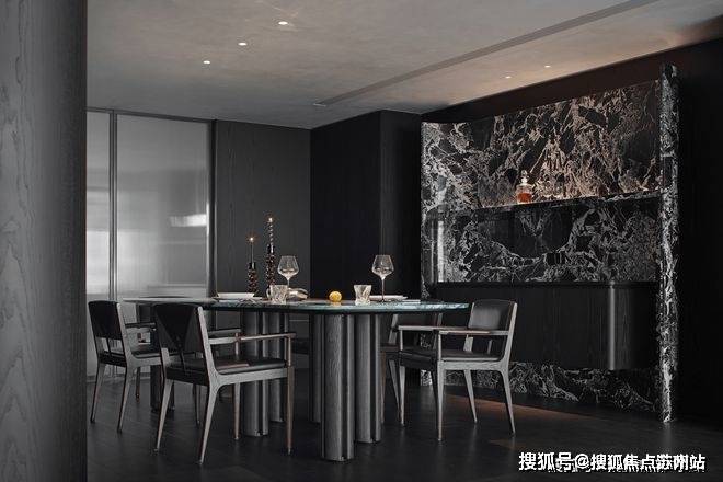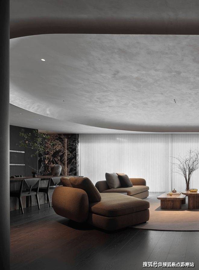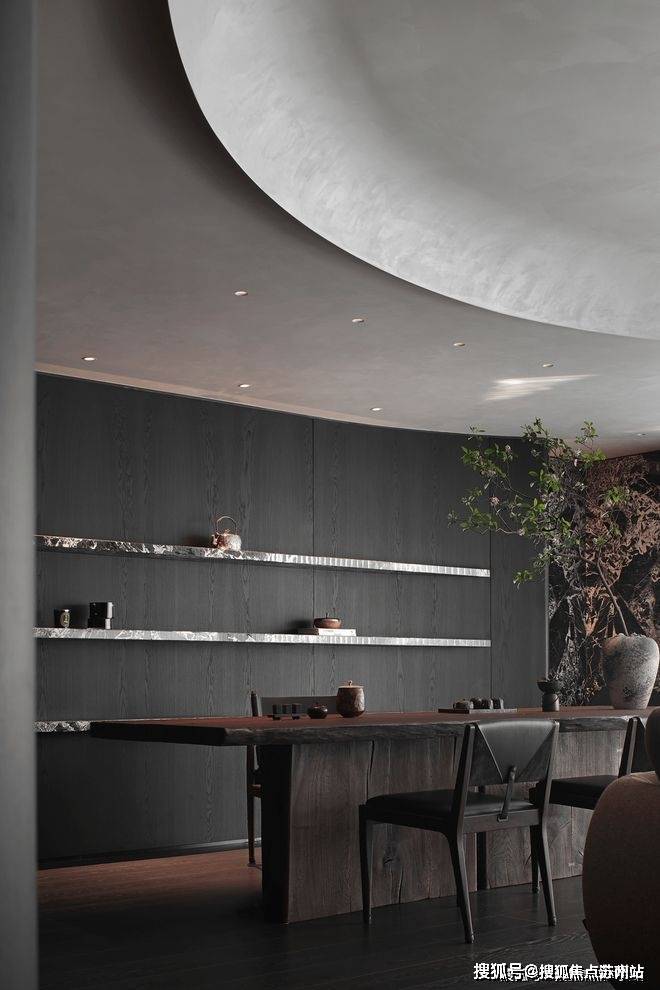 业主的想法与执著设计的理念不谋而合,满足功能性需求后,以“隐于形的诗意”为核心,通过精心策划,打破了线性空间的固有逻辑,于蜿蜒的曲线形态与深色空间画布中,缔造出明朗大气、优雅静谧的氛围感。