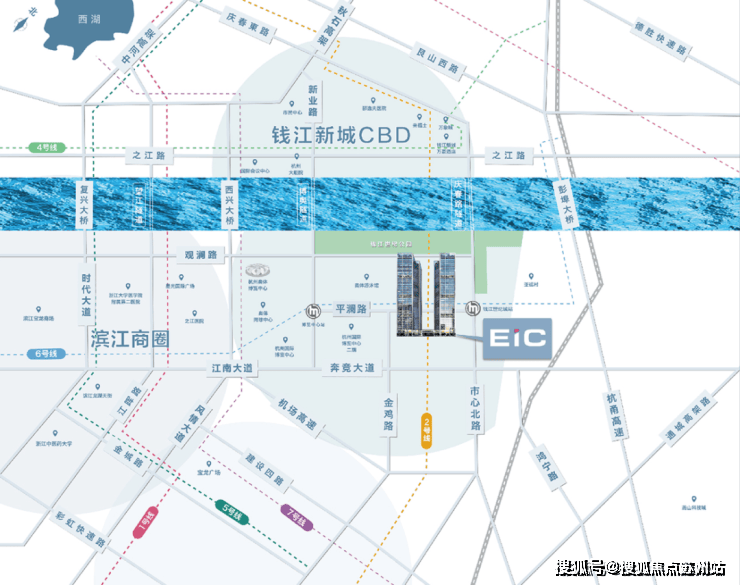 建工EIC傲立于杭州萧山奥体CBD核心区,紧邻钱塘江2.4公里黄金江岸线,与奥体博览中心、杭州之门形成“黄金三角”,坐拥长三角城市群核心发展红利。