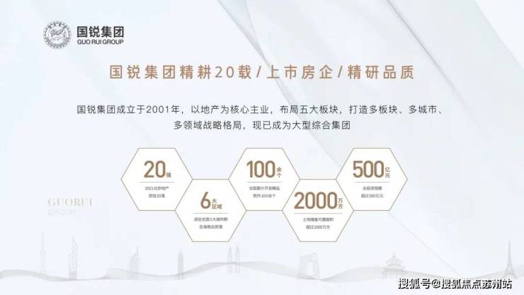 国锐集团成立于2001年,以地产为核心主业,布局五大板块,打造多板块、多城市、多领域战略格局,现已成为大型综合集团。截止目前国锐集团已经布局国内6大区域,截至目前,荣获2021年北京地产资信20强、全国累计开发项目100多个、总资产投资规模约500亿、土地储备可建筑面积超过2000万方。