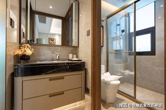 卫生间甄选唯宝的台下盆、汉斯格雅的龙头+恒温花酒,玫瑰岛的淋浴房,科勒的智能一体马桶+浴缸+浴缸龙头等,生活质感肉眼可见。