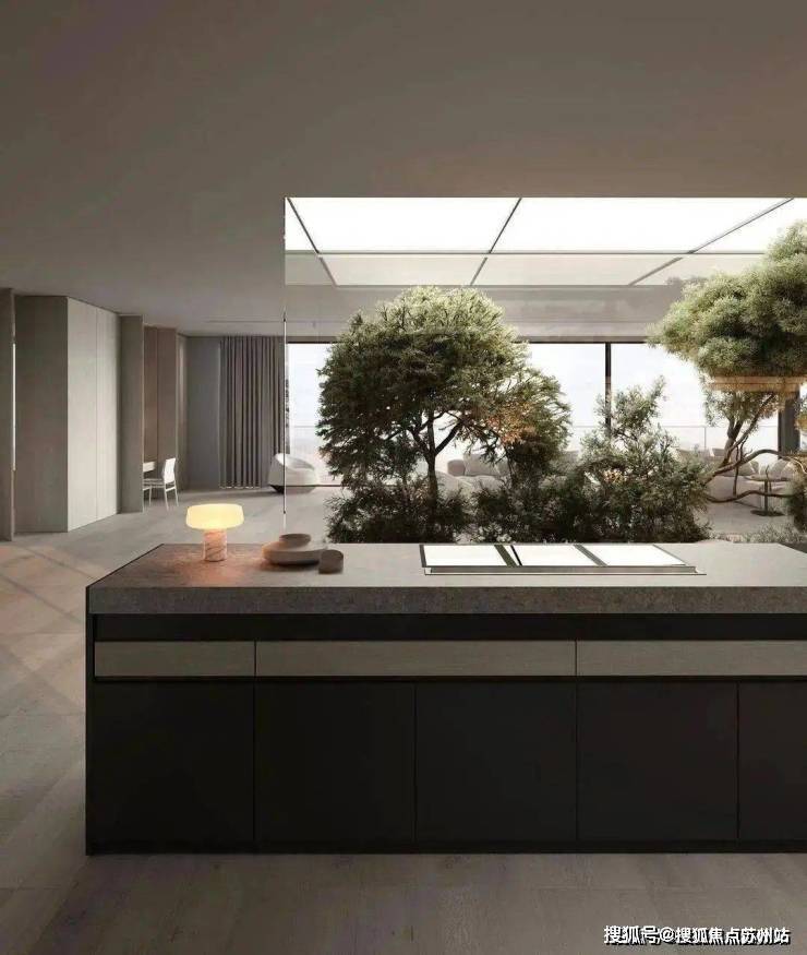 The central glass compartment is even more stunning, and the lush pine trees inside the transparent glass cabinets on all sides are like natural spirits, bringing a sense of elegance to the home. This large flat is not only a living space, but also a perfect interpretation of a lifestyle attitude.