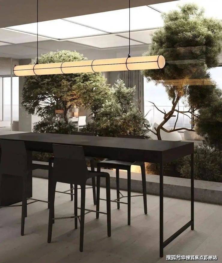 高耸入云的松树,宛如天然的屏障,将宽敞的会客厅与用餐区域巧妙地分隔开来。尽管身处同一空间,却给人一种神秘莫测的感觉。哑光黑的桌椅与铁艺吊灯,赋予了空间一丝现代潮流的气息。