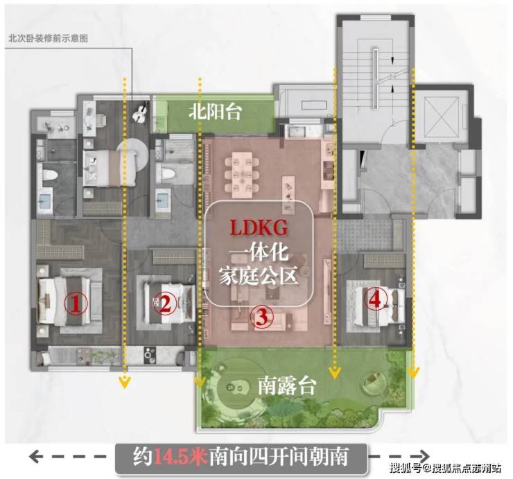 南向约14.5m超大面宽,三卧朝南布局,这一面除了必须的墙体,都是玻璃和露台,采光面史诗级!