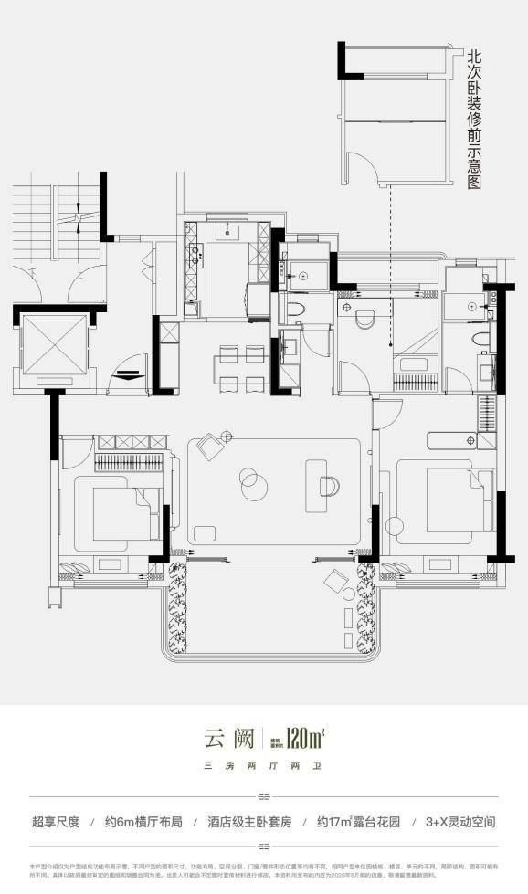 约120㎡三房:空间更阔绰,居住舒适度升级,是舒适三房的优选。