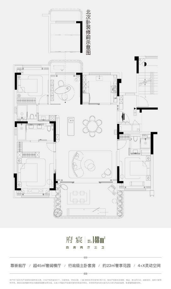 约148㎡四房:三代同堂或改善家庭的理想之选,尊享私密与宽敞。