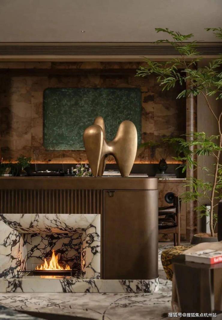 而且这个空间的装标也是非常精致的,1.7米双扇铸铝门,搭配宝格丽石材与祥云灰拼花,延伸至电梯厅。皇家白玉石玄关,兼具储物与展示功能,质感温润。
