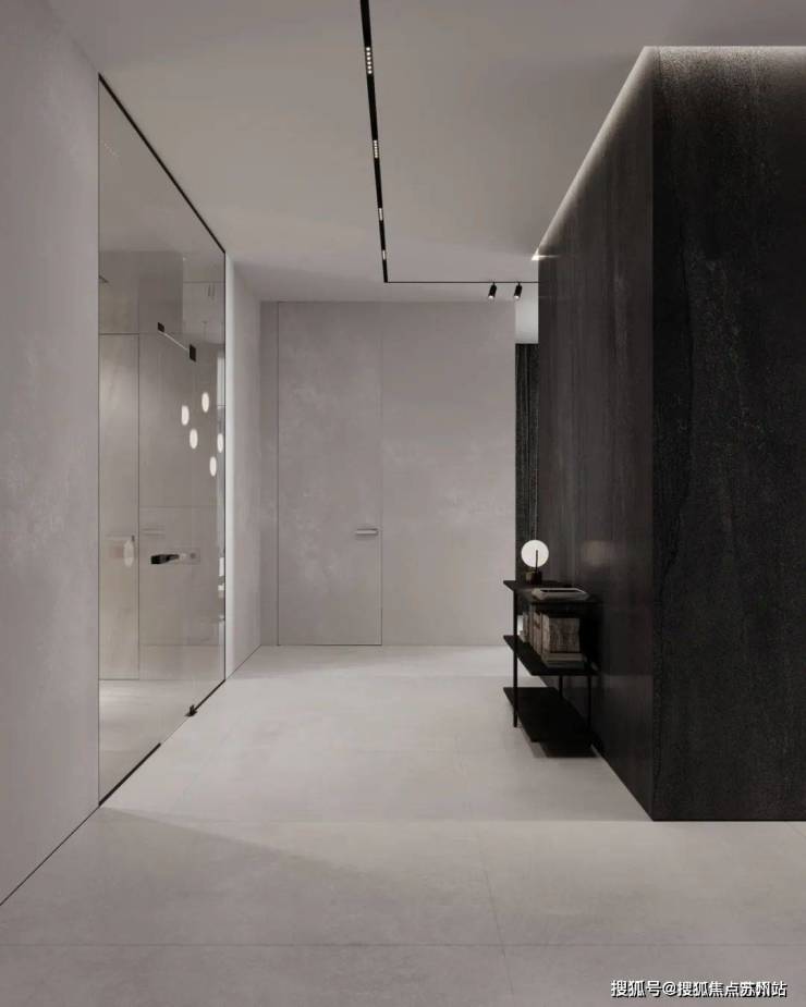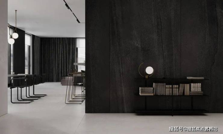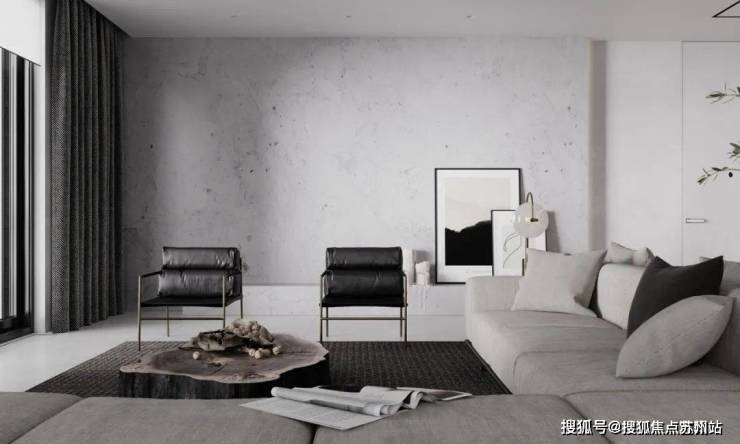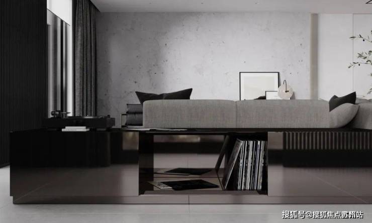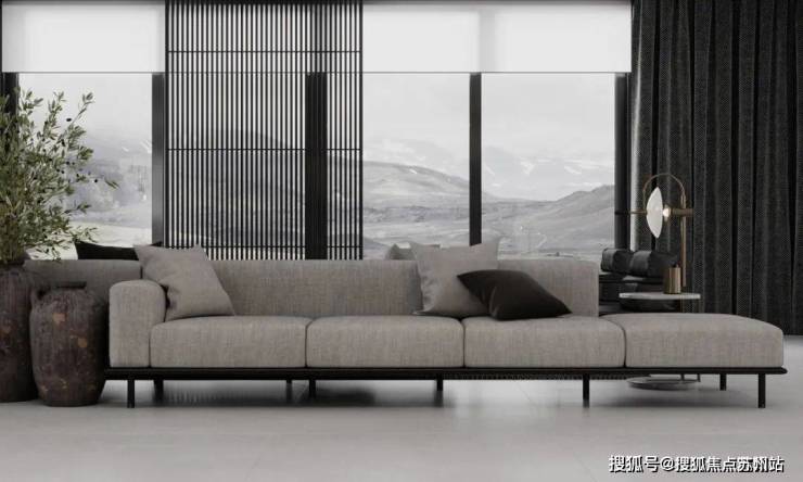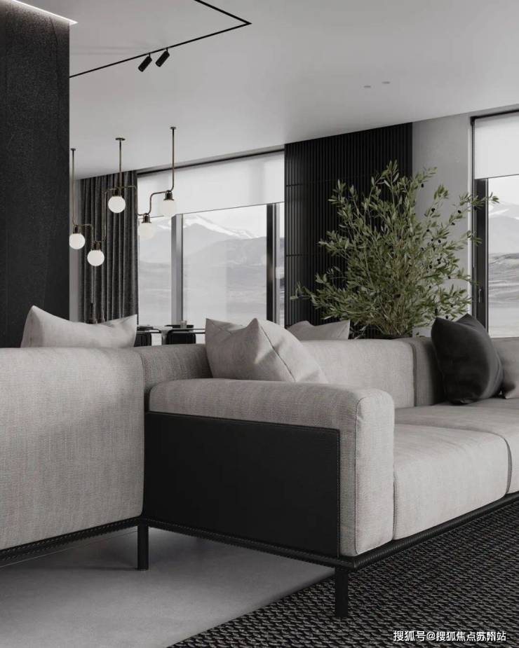 客厅以黑灰的配色提升了整体的高级感。落地窗将户外的美景都容纳于空间中的同时,也提升了客厅的开阔与光线的饱和。