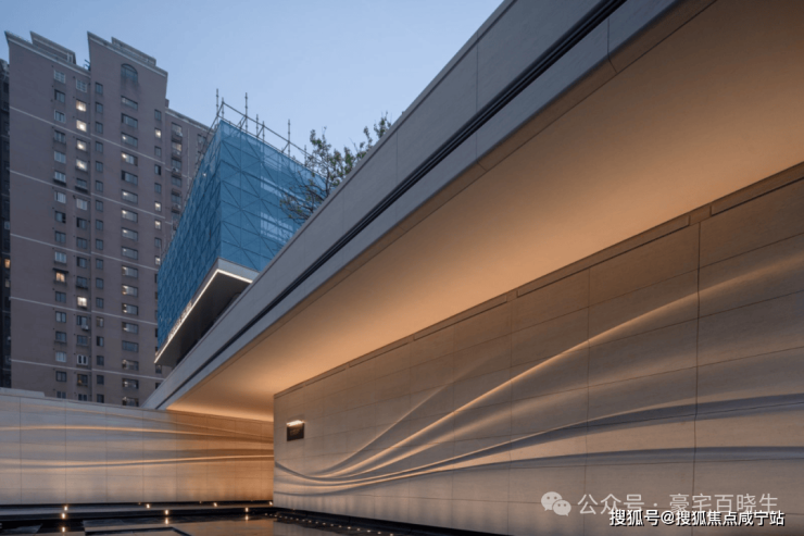 稍微走近一点就能看到采用了大量的弧形元素和石材材料.石材的质感本身就厚重,在上面叠加类似海浪的线条弱化了厚重感,反而显得轻盈.