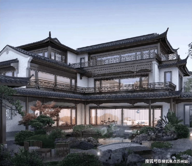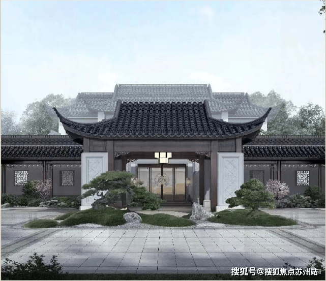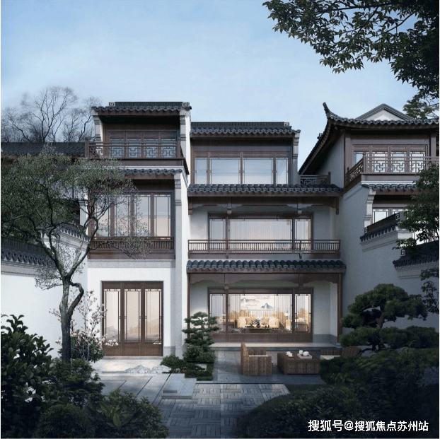 从公布的别墅外立面来看,项目采用 仿石材勒脚、铝合金门窗、铝型材搭配小青瓦和米暖白色涂料,打造出传统又具有现代感的新中式风格。南向大面积的落地窗结合镂空花格窗,飞檐翘角、黑瓦白墙,独具特色。