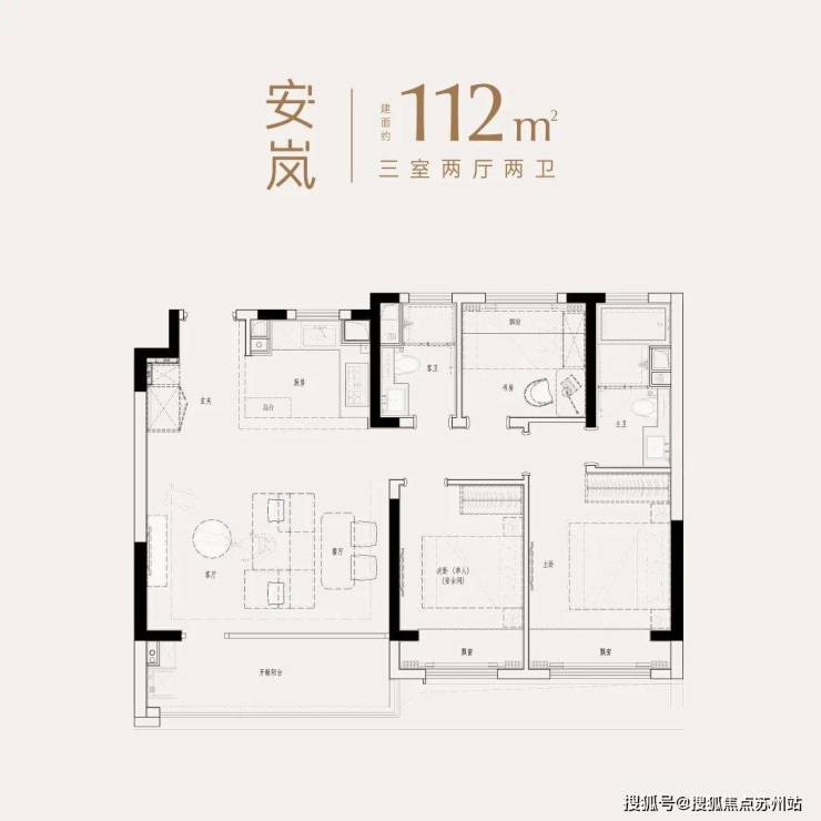 建面约112㎡的"安岚"户型是三室两厅两卫的设计。这个户型非常方正,南向面宽很大,整个房子采光通透,阳光和清风可以轻松进入室内。客厅和餐厅是连在一起的LDKB一体化设计,约5.3米的横厅让家庭聚会更加舒适。厨房是半开放式的,空间灵活,动线科学,让烹饪成为一种享受。主卧是套房设计,还预留了衣帽区,配有观景飘窗,可以在这里享受悠闲时光。